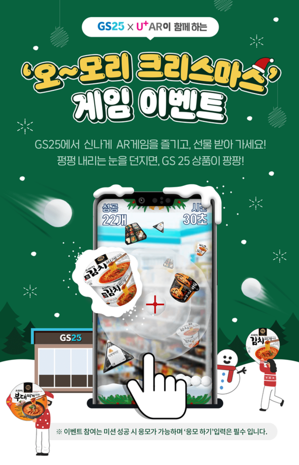 GS리테일이 운영하는 편의점 GS25와 슈퍼마켓 GS더프레시를 방문하는 고객은 U+AR앱 카메라에 오모리 김치찌개 또는 공화춘 용기면 뚜껑을 촬영하면 바로 '오~모리크리스마스' AR게임을 할 수 있다. AR게임 미션 완료 후 응모한 고객 대상으로 추첨을 통해 추가 경품을 제공한다. 해당 이벤트는 오는 21일부터 31일까지 진행되며, 통신사와 관계 없이 스마트폰을 가지고 있는 모든 고객이 U플러스 AR앱만 다운로드 하면 참여가 가능하다.