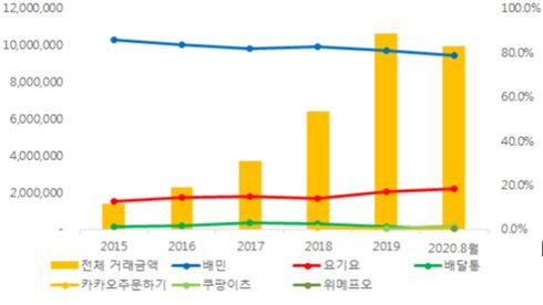 공정위에 따르면 배민·요기요 점유율 합계가 지난해 거래액 기준 99.2%로 1위이고, 2위인 '카카오 주문하기'와 격차가 98.8%p로 경쟁제한성이 추정된다. 최근 '쿠팡이츠'의 점유율이 수도권 일부 지역을 중심으로 증가하고 있으나 전국 기준 5% 미만이다.