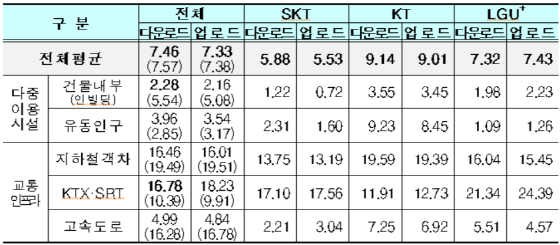 옥외(행정동) LTE 전환율은 4.11%, 다중이용시설·교통인프라 LTE 전환율은 7.46%로, 다중이용시설·교통인프라의 LTE 전환이 더 높았다. 다운로드시 평균 LTE 전환율은 대전광역시가 1.50%로 가장 낮고 전라남도가 8.40%로 가장 높았다. 서울시는 7.91%로 전체평균 보다 높았다.