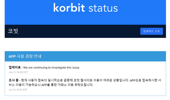 이날 오후 4시 30분 현재 코빗 홈페이지에는 "현재 사용자 접속이 일시적으로 급증해 코빗 웹사이트 이용이 어려운 상황"이라며 "APP으로 접속하시면 서비스 이용이 가능하오니 APP을 통한 거래소 이용 부탁드린다"라는 공지가 올라와 있다.