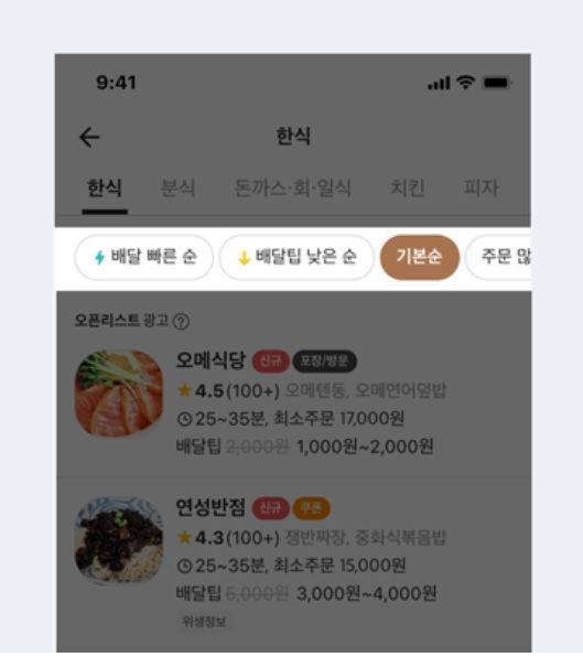 개편 이전과 비교해 가장 큰 차이점은 신설된 정렬 순서에 따라 예상 배달 시간과 음식점에서 설정한 배달팁을 기준으로 음식점이 노출된다. 울트라콜(8만8000원의 월정액 광고)과 오픈리스트(중개 수수료 5.8%) 등 음식점이 가입한 광고 상품 등 기준으로 정렬됐던 기본순과는 다르다.