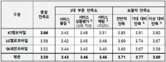종합만족도는 평균 3.59점이며 사업자별로는 KT엠모바일 3.66점, LG헬로모바일 3.58점, SK세븐모바일 3.52점 순이었다.