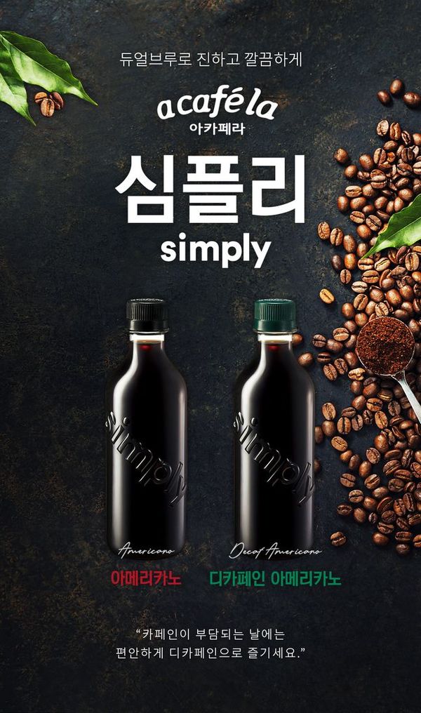 아카페라 심플리는 듀얼브루(에스프레소+콜드브루) 공법을 적용한 원두 추출액을 사용해 첫 맛은 진하고 뒷 맛은 깔끔한 것이 특징이다. 소비자들이 넉넉하게 즐길 수 있도록 400ml 용량으로 제작됐으며 검정색 뚜껑의 아메리카노와 녹색 뚜껑의 디카페인 아메리카노 2종이 출시됐다.