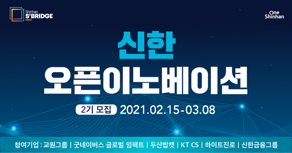 신한금융그룹이 운영하는 스타트업 육성 플랫폼 'S² Bridge : 서울'(신한 스퀘어브릿지)에서 15일부터 3월8일까지 '신한 오픈이노베이션(Shinhan Open Innovation)' 2기 프로그램에 참여할 기술 스타트업들을 모집한다고 밝혔다.