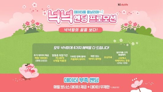KT스카이라이프는 최대 2년 동안 매월 데이터 100GB를 추가로 제공하는 '넉넉엔딩 프로모션'을 시행한다고 3일 밝혔다.