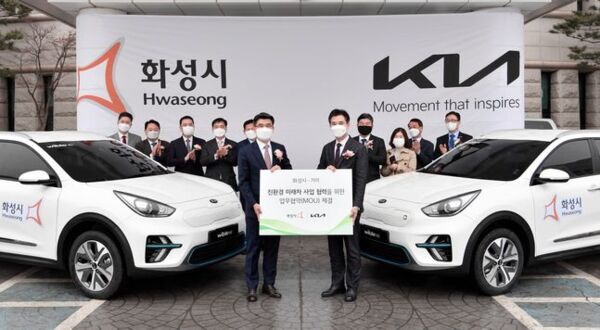 기아는 지난 12일 화성시청에서 서철모 화성시장, 기아 송호성 사장 등 주요 관계자들이 참석한 가운데 화성시와 친환경 미래 모빌리티 산업 발전과 화성형 그린뉴딜 실현을 위한 ‘친환경 미래차 협력’ 업무협약을 체결했다고 14일 밝혔다.