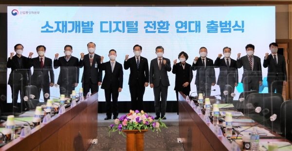 한화솔루션은 15일 산업통상자원R&D전략기획단, 한국화학연구원, 한국재료연구원 등 연구기관들과 소재 산업의 디지털 전환을 통한 경쟁력 강화를 목적으로 업무협약을 체결했다. ‘소재개발 디지털 전환 연대’에 참여한다. 대전 화학연구원에서 열린 출범식에는 성윤모 장관, 한화솔루션 이구영 대표 등 참여기업 대표자, 소재 연구기관장 등이 참석했다.