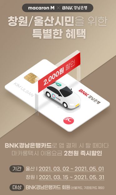 경남BC카드 마카롱M택시 할인 이벤트 기간 마카롱M앱(App)에 등록된 경남BC카드로 창원시(행정구역상 출발 기준) 마카롱M택시를 이용하면 횟수제한 없이 택시요금 2000원을 즉시 할인해준다.