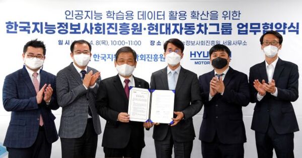 현대차그룹은 한국지능정보사회진흥원과 '인공지능 학습용 데이터 공유 업무협약(MOU)'을 체결했다고 8일 밝혔다.