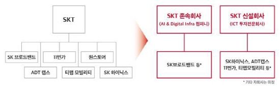 SK텔레콤은 AI & Digital Infra 컴퍼니(SKT 존속회사)와 ICT 투자전문회사(SKT 신설회사)로 인적분할을 추진한다. SKT 존속회사에는 SK브로드밴드 등을, 신설회사에는 SK하이닉스, ADT캡스, 11번가, 티맵모빌리티, 원스토어, 웨이브 등 ICT 계열사를 자회사로 둘 방침이다.
