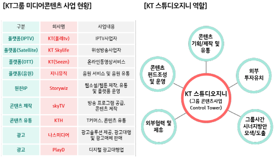 그룹의 미디어 역량을 키우는 것은 구현모 KT 대표의 '탈통신' 전략 일환이다. 구 대표는 "2025년 비통신 매출 10조원을 달성, 통신과 비통신 매출 비중을 5:5로 맞추겠다"고 강조해왔다. 핵심이 미디어이다. KT는 KT 스튜디오지니를 중간지주사로 KT 그룹사 내 스토리위즈, 스카이티브이, 지니뮤직, 시즌 등 관련 회사를 통합하는 방안도 검토하고 있다.