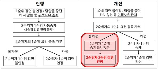 1순위 자진신고자가 담합을 중단하지 않는 등의 이유로 감면을 받지 못하는 경우 별다른 귀책사유가 없는 2순위 자진신고자도 감면을 인정받지 못할 가능성이 있었는데, 앞으로는 위와 같은 경우 2순위 자진신고자도 담합 적발에 기여한 만큼 감면을 받을 수 있게 된다.