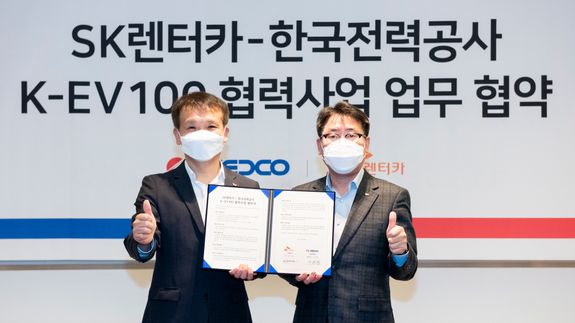 SK렌터카는 16일 한국전력과 서울 광진구 워커힐 아카디아에서 ‘K-EV100 협력사업’ 협약을 체결, 지난달 선언한 K-EV100(한국형 무공해차 전환100) 관련한 중점 과제 추진에 나선다고 밝혔다.