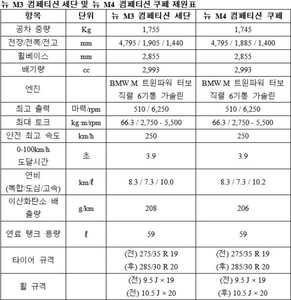 국내에는 고성능 M 하이 퍼포먼스 모델 중에서도 상위 모델인 '컴페티션(Competition)' 사양이 기본으로 출시되며 올해 하반기에는 M3와 M4 모델 최초로 사륜구동 시스템인 ‘M xDrive’ 탑재 모델이 추가될 예정이다.
