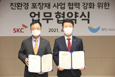 SKC와 SPC팩은 29일 서울 종로구 SKC 본사에서 ‘친환경 포장재 사업 협력 업무협약식’을 열고 생분해 포장재 확대를 위해 협력하기로 했다.