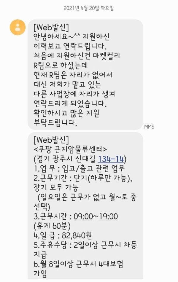 지난달 20일 마켓컬리 채용 담당 대행사는 기자에게 '쿠팡 곤지암 물류센터' 채용 문자를 보냈다. "지원하신 이력 보고 연락드린다. 처음에 지원하신 건 마켓컬리 R팀으로 하셨는데 현재 R팀은 자리가 없어서 저희가 맡고 있는 다른 사업장에 자리가 생겨 연락드리게 됐다"는 내용이 문자에 담겼다. 마켓컬리 냉장 물류센터에 근무하기 위해서는 해당 채용팀에서 보낸 출근 신청 링크를 통해 소정의 양식(△성함 △연락처 △지원파트 △근무가능일)을 작성해 제출해야 한다.