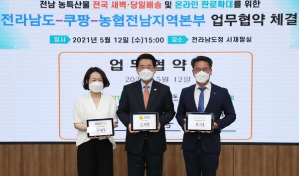 쿠팡은 전라남도, 농협중앙회 전남지역본부(이하 전남 농협)와 '지역 우수 농특산품 온라인 판로 확대와 소비촉진을 위한 업무협약(MOU)'을 체결했다고 12일 밝혔다.
