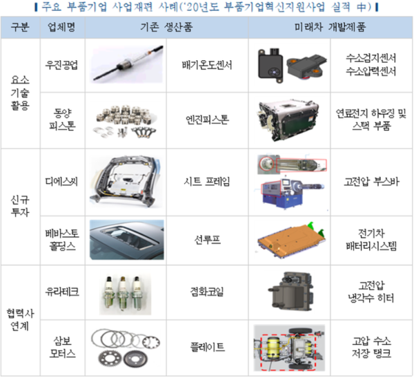 산소·배기온도 센서를 생산하는 우진공업은 수소압력센서를, 엔진피스톤을 생산하는 동양피스톤은 연료전지 하우징 및 스택 부품을, 엔진계 냉각부품을 생산하는 인지컨트롤스는 수소차 열 제어 통합 모듈을 생산한다는 계획이다.