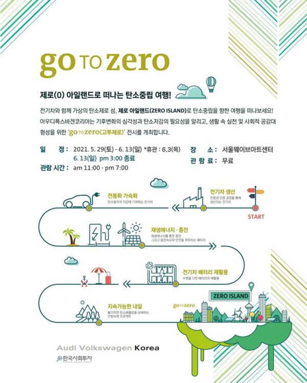 본사의 전략에 기반해, 아우디폭스바겐코리아는 기후변화의 심각성과 탄소저감의 필요성을 알리고, 일상생활 속 실천과 사회적 공감대 형성을 위한 ‘고투제로(goTOzero)’ 전시를 개최한다. 전시공간은 친환경 인증 공장에서 생산돼 그린 에너지로 충전하는 전기차와 다양한 e-모빌리티 솔루션으로 채워진 가상의 탄소제로 섬, ‘제로 아일랜드’ 콘셉트로 꾸며졌다. 이번 전시는 28일 미디어데이를 시작으로 내달 13일까지 서울 서초구에 위치한 서울웨이브아트센터에서 열리며, 별도 예약 없이 누구나 무료로 관람이 가능하다.