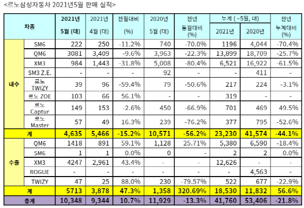 내수 판매 주력 차종은 QM6로 총 3081대가 판매됐다. 르노 브랜드 모델은 도심형 전기차 조에와 중형 상용차 마스터가 각 103대 및 77대 출고됐다.