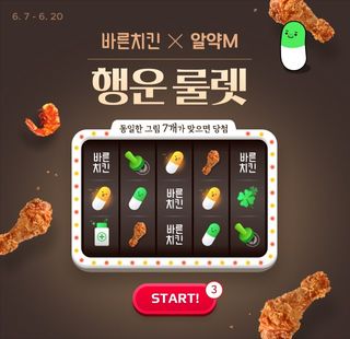 이번 행운룰렛 프로모션은 오늘부터 오는 20일까지 약 2주간 진행된다. 프로모션 기간 동안 알약M 첫 화면에 나타나는 이벤트 페이지를 통해 누구라도 응모 가능하다. 룰렛을 돌려 바른치킨 또는 알약M과 관련된 동일 그림 7개가 나타나면 경품에 당첨된다.