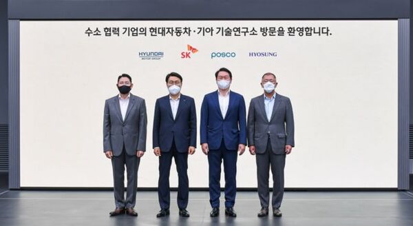 10일 정의선 현대차그룹 회장, 최태원 SK그룹 회장, 최정우 포스코그룹 회장, 조현준 효성그룹 회장이 현대자동차·기아 기술연구소에서 만나 수소기업협의체 설립을 논의했다.