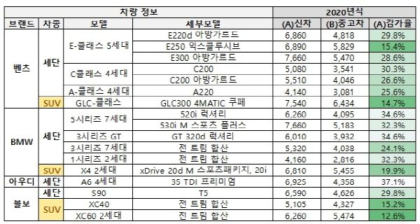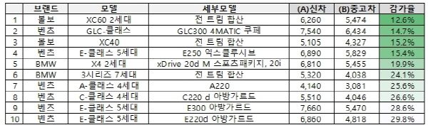 수입차 가격 방어가 가장 잘 되는 브랜드는 벤츠로 감가율 낮은 순위 10위 안에 6개가 올랐다. 세단 E클래스, C클래스, A클래스 등의 매입가가 타사 대비 높았으며 연료별로는 디젤 차량 감가율이 높게 나왔다.