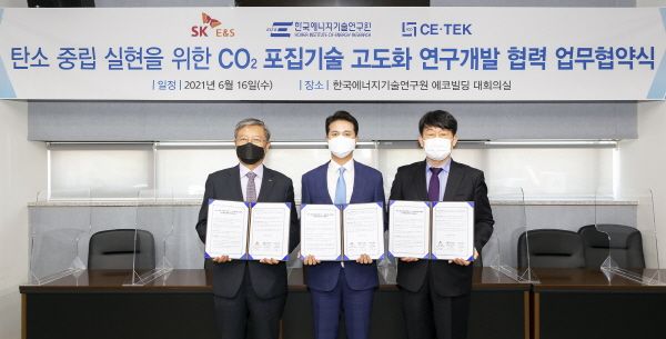 SK E&S는 16일 대전 유성구 한국에너지기술연구원에서 에너지기술연구원 및 씨이텍과 함께 'CO₂ 포집기술 고도화 및 실증∙상용화 연구' 업무협약을 체결했다. SK E&S 추형욱 사장, 김종남 에너지기술연구원장, 이광순 씨이텍 대표이사가 참석했다.