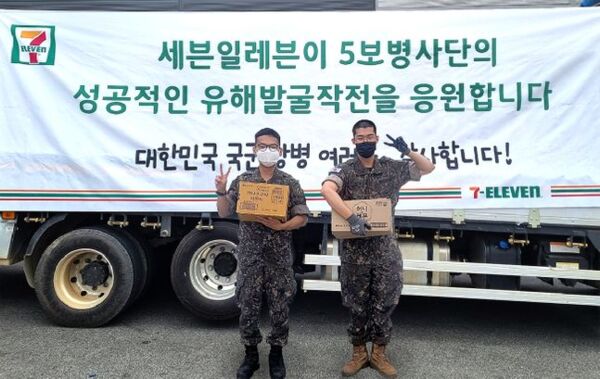편의점 세븐일레븐은 6.25 한국전쟁 기념일을 앞두고 유해발굴 작전에 참여하고 있는 육군 제5보병사단(경기도 연천) 장병들을 위해 간식과 음료 2만여개를 지원했다고 18일 밝혔다.