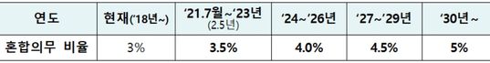 수송용 연료에 대한 신재생에너지 연료 혼합의무 비율이 현행 3%에서 내달부터 3.5%로 상향되고, 3년 단위로 0.5%p씩 단계적으로 높아져 2030년에는 5.0%까지 확대된다.