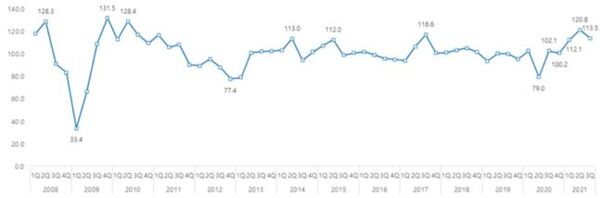 한국무역협회 국제무역통상연구원이 국내 1201개 수출기업을 대상으로 조사한 ‘2021년 3/4분기 수출산업경기전망조사’에 따르면 3분기 EBSI는 113.5로 지난 1분기(112.1)와 2분기(120.8)에 이어 3분기 연속 110을 상회했다.