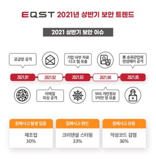 EQST는 올해 상반기에 발생한 주요 보안 이슈로 △공급망 공격 △이메일 피싱 공격 △기업 내부 자료 다크 웹 유출 △미국 최대 송유관 업체 랜섬웨어 공격 등을 꼽았다.