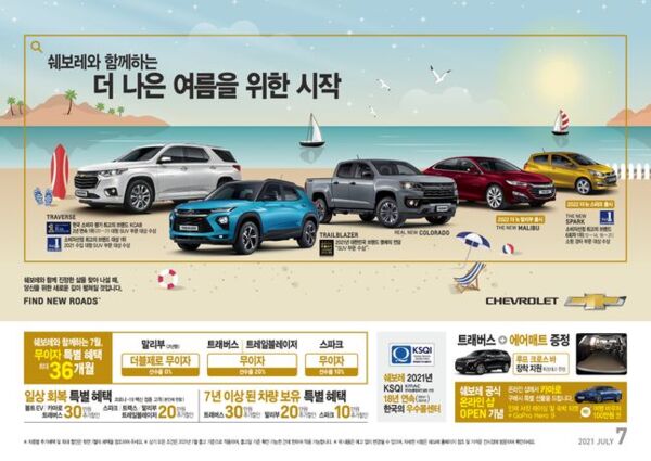 쉐보레가 7월 ‘쉐보레와 함께하는 더 나은 여름을 위한 시작’ 프로모션을 통해 국내 고객들에게 풍성한 혜택을 제공한다.