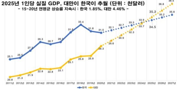 대만이 2015~2020년 연평균 성장세(대만 4.46%, 한국 1.85%)를 지속할 경우 2003년 한국에 역전당한 대만의 1인당 GDP는 2025년경 한국을 역전할 것으로 예측된다. 2025년 한국의 1인당 GDP는 3.45만 달러, 대만은 3.52만 달러로 추산된다. 2019년 기준 1인당 실질 GDP는 한국이 3만1846 달러로 세계 32위, 대만은 2만5936 달러로 세계 39위를 나타낸 바 있다.