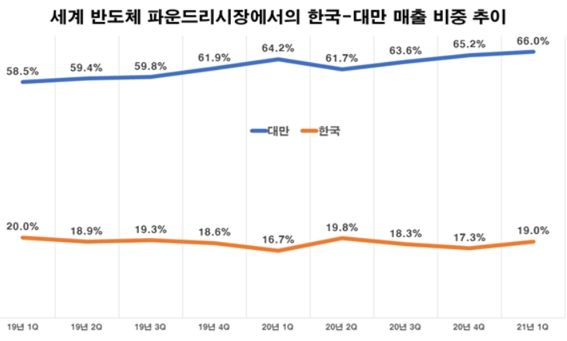 특히 TSMC, UMC, Powerchip, Vanguard 등은 세계 파운드리 시장의 절대 강자 기업들은 코로나 펜데믹 발생으로 재택근무, 원격교육 등으로 컴퓨터 수요가 증가하면서 매출액 기준으로 세계 반도체 파운드리 시장에서 비중이 2019년 1분기 58.5%에서 2021년 1분기 66%로 7.5%p 높아졌다.