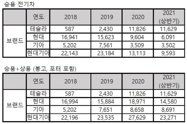 현대차·기아가 전략 전기차를 앞세워 승용 전기차 1위 테슬라를 바싹 추격하고 있다. 승용·상용 합산 판매량에서는 이미 테슬라를 압도하면서 전기차 시장 점유율 1위에 올랐다. 아이오닉5·EV6가 본격 양산되는 하반기에는 승용 부문에서도 테슬라를 제칠 것으로 예상된다.