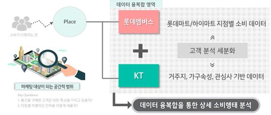 결합에 사용된 KT 가명데이터는 KT가 보유한 고객 성별과 연령별 정보 및 빅데이터 분석을 통해 도출한 거주지‧근무지‧관심분야‧가구구성 형태 추정 정보다. 롯데멤버스는 롯데멤버스회원이 롯데마트와 하이마트에서 구매한 상품 품목정보‧구매금액이다.