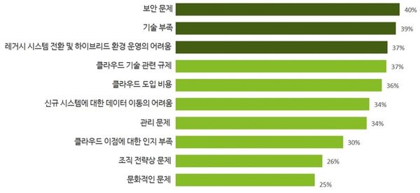 한국의 경우 클라우드를 도입하지 않았거나 검토중인 기업의 비율이 49%로 아태지역 평균보다 높은 수치를 보였다. 클라우드 기술 도입을 방해하는 문제에 대해 보안(40%), 기술 부족(39%), 레거시 시스템에서의 전환과 하이브리드 운영의 어려움(37%)이 이유로 꼽혔다.