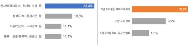 전경련은 제조업종의 가장 큰 애로사항으로 ‘원자재(Raw Material)’, ‘규제(Regulation)’, ‘노동(Labor)’, ‘물류(Logistics)’ 등 ‘2R2L’로 요약했다. 원재료비 상승에 따른 수익성 악화, 국내외 규제 강화 대응, 노동 경직성, 선박 및 컨테이너 수급난, 물류 운임 상승에 따른 기업 부담이 큰 것으로 진단했다.