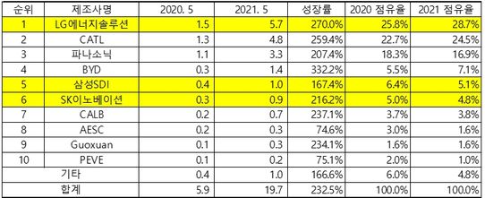 삼성SDI는 2.6배 이상 증가한 1.0GWh를 기록했지만 순위는 전년 동기 4위에서 5위로 내려갔다. SK이노베이션은 3.1배가 넘는 성장세를 시현하며 순위는 6위를 지켰다.