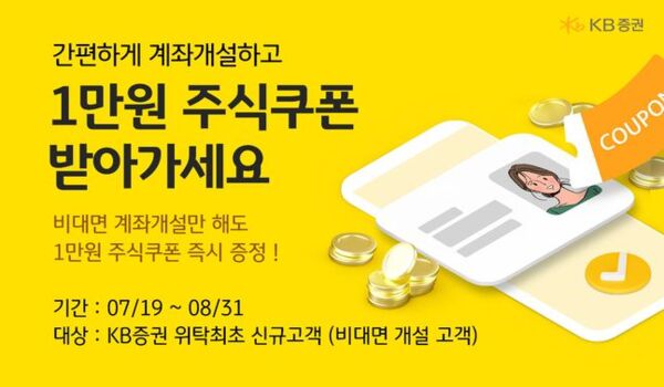 KB증권은 KB증권 모바일 매체(MTS, 웹페이지)를 통한 비대면 신규 계좌 개설 고객을 대상으로 국내주식 매수 시 현금처럼 사용할 수 있는 '주식쿠폰증정' 이벤트를 실시한다고 21일 밝혔다.