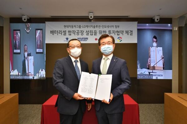 현대차그룹과 LG에너지솔루션은 인도네시아에 연산 10기가와트시(GWh) 규모의 배터리셀 합작공장 설립을 위해 인도네시아 정부와 투자협약을 체결했다고 29일 밝혔다.