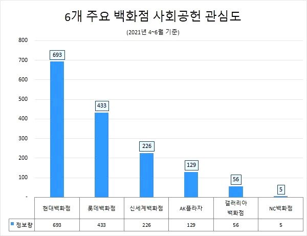 해당 기간 '사회공헌', '성금', '기부', '봉사', '취약계층', '불우', '기탁' 키워드를 담아 작성한 게시글이 가장 많은 백화점은 현대백화점으로 총 693건 검색됐다.