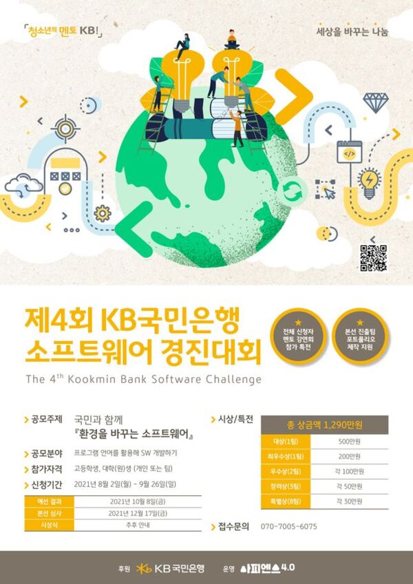 KB국민은행은 디지털 시대에 맞는 창의적인 인재 발굴을 위해 제4회 '청소년의 멘토 KB!' 소프트웨어 경진대회를 개최한다고 밝혔다.