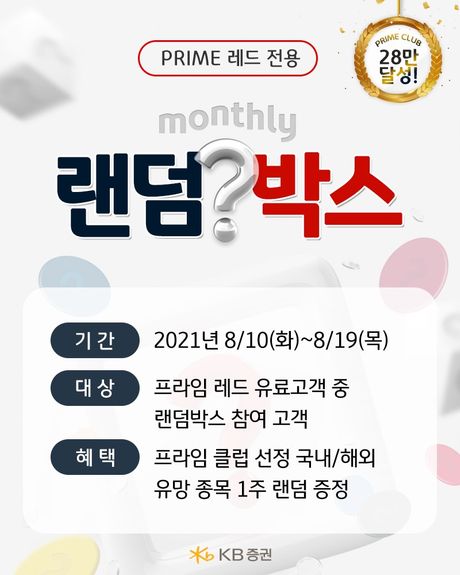 KB증권은 연말까지 매월 '프라임 클럽 레드 서비스' 유료 결제 월 1만원 개인 고객 중 랜덤 박스 참여 고객을 대상으로 프라임 클럽에서 선정한 국내외 유망 주식 중 1종목을 증정하는 '프라임 클럽 레드 매월 1종목 랜덤 박스 이벤트'를 진행한다고 9일 밝혔다.
