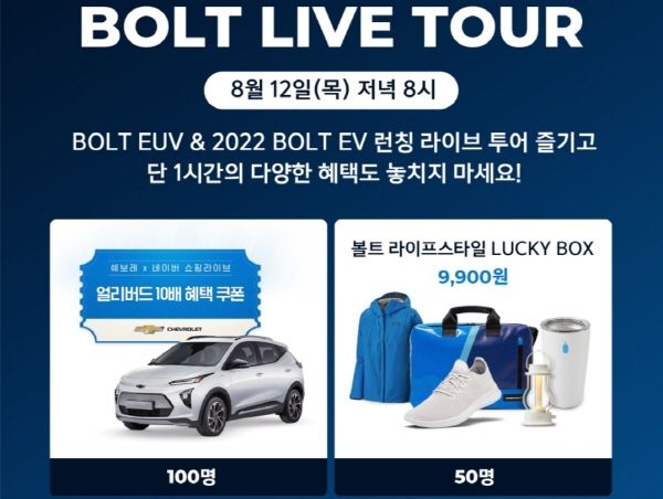 쉐보레가 12일 저녁 8시부터 네이버 쇼핑라이브에서 '볼트 EUV'와 2022년형 '볼트EV' 런칭 라이브 투어를 진행한다. 라이브 방송에는 스타일리스트 서수경, 모터그래프 전승용 편집장과 함께 배우 이제훈, 이동휘 등이 게스트로 함께 출연한다.