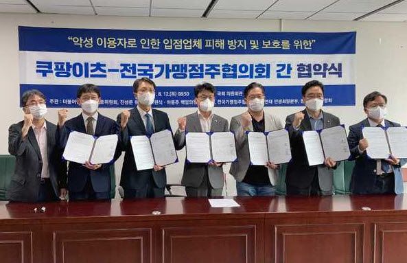 쿠팡은 자사 운영 배달 앱 쿠팡이츠가 12일 국회에서 전국가맹점주협의회와 '악성 이용자로 인한 입점업체 피해 방지 및 보호를 위한 협약'을 체결했다고 밝혔다.