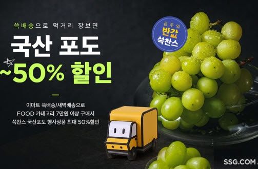 SSG닷컴은 19일과 20일 양일간 신선식품을 반값에 제공하는 쓱찬스 행사도 함께 진행한다. 쓱배송 및 새벽배송으로 식품 카테고리 상품 7만원 이상 구매시 샤인머스캣, 거봉, 캠벨포도 등 포도를 최대 50% 할인가에 제공한다.