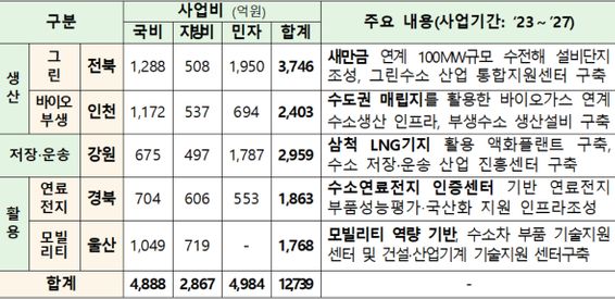 전북 '그린수소 생산'은 새만금 연계 100MW 규모 수전해 설비단지 등 그린수소 클러스터를 조성한다. 인천 '바이오‧부생수소 생산'은 수도권 매립지 활용 바이오가스 연계 수소생산 및 부생수소 관련 클러스터를 구축한다.