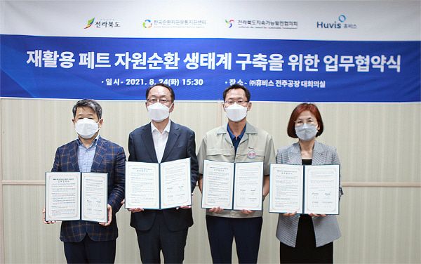 휴비스는 전주공장에서 전라북도·지속가능발전협의회·순환자원유통지원센터와 ‘재활용 페트 자원순환 생태계 구축 업무협약’을 체결했다고 25일 밝혔다. 폐자원인 투명 페트병의 재활용 촉진을 통해 탄소중립을 실천하도록 지자체·기업·민간이 상생협력 체계를 구축하려는 취지다.